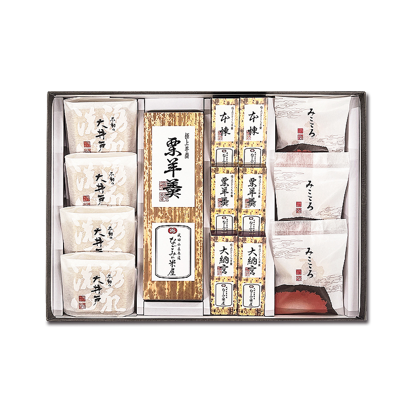 ◆詰合せ内容:不動の大井戸最中4・極上ひとくち羊羹(栗、本煉、大納言 各2)・極上栗羊羹1・みこころ3